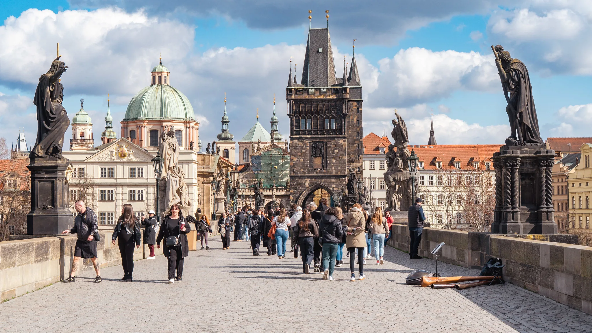 Tällä kertaa sillalla oli oikein miellyttävää käyskennellä. Väkeä oli maltillisesti ja katuorkesterit pitivät tunnelmaa hienosti yllä. Jotkut pistivät vallan tanssiksi ja mikäpä siinä, kun aurinko hyväili ja olo oli leppoisa. Pyhimykset katselivat hyväksyvän näköisinä, vaikkakin päätään pyöritellen näitä nykyaikojen kotkotuksia. Koululaisjoukko kirmaili opettajansa johdolla vauhdilla ja iloisesti kirkuen patsaalta toiselle.